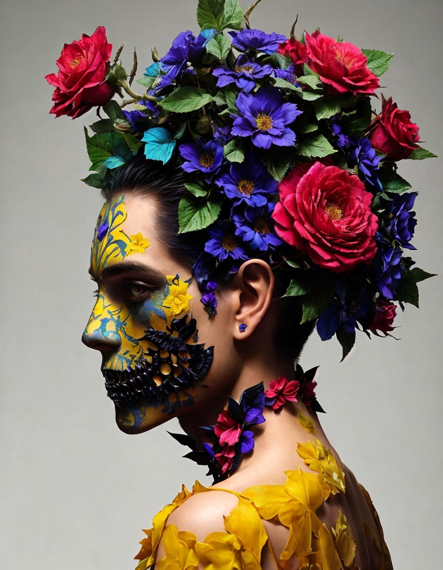 A woman with vibrant floral makeup and a headpiece made of lush, colorful flowers poses artistically against a neutral backdrop.
