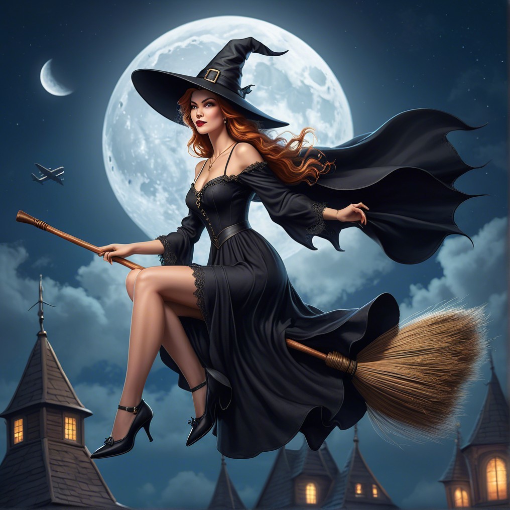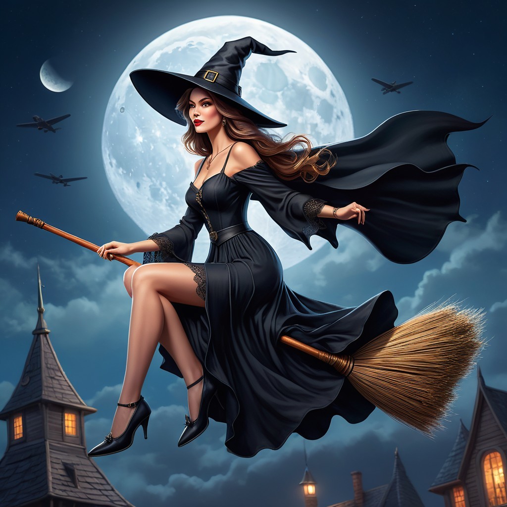 A stylish witch in a black dress and hat soars through the night sky on a broomstick, illuminated by a full moon, with rooftops silhouetted below. A mystical scene of enchantment and elegance.