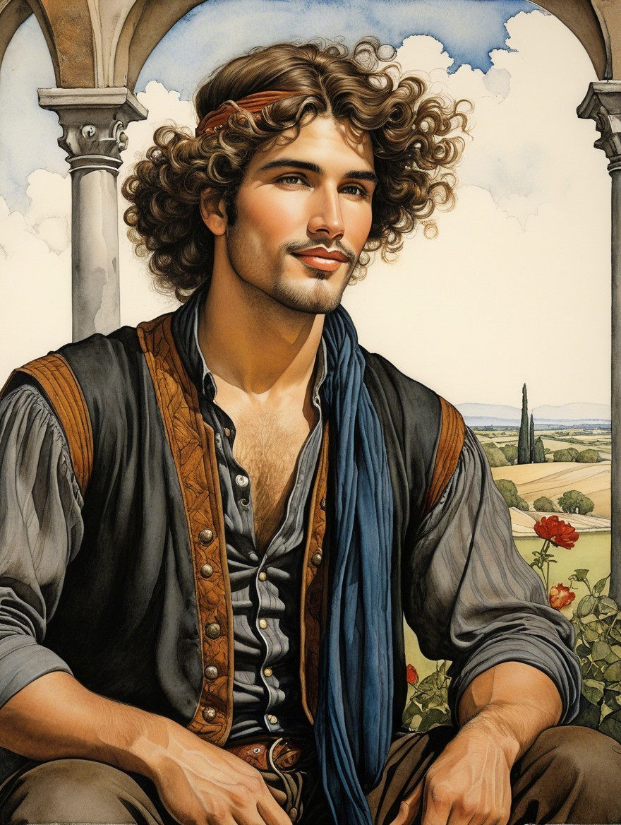 A handsome man with curly hair and a stylish mustache, wearing a black shirt and a broad-brimmed hat, stands confidently outdoors, surrounded by lush greenery and a scenic landscape.