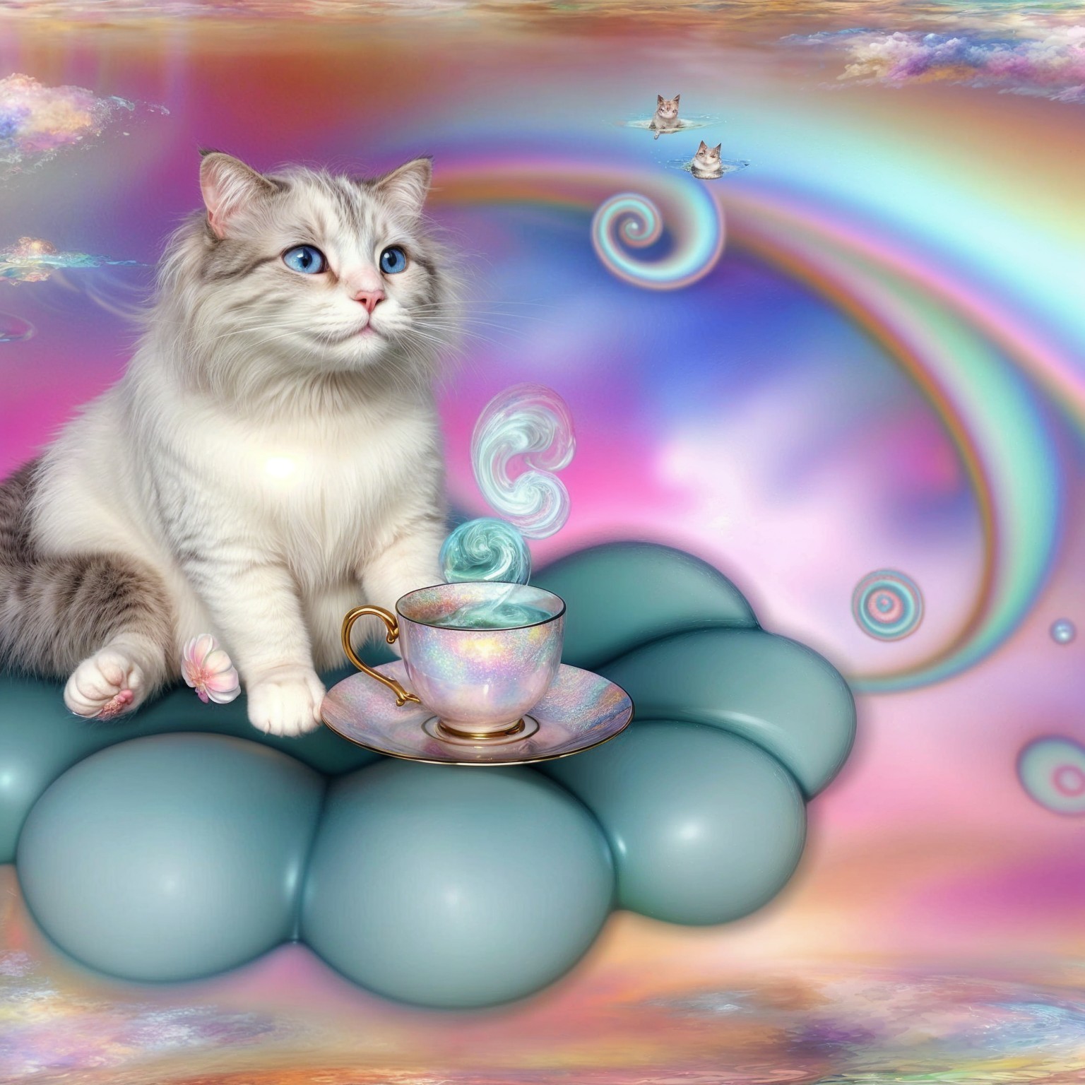 A whimsical scene of a fluffy cat sitting on a cloud, gazing at a glowing orb in a delicate teacup. The background features a vibrant rainbow and dreamy pastel swirls, enhancing the magical atmosphere.