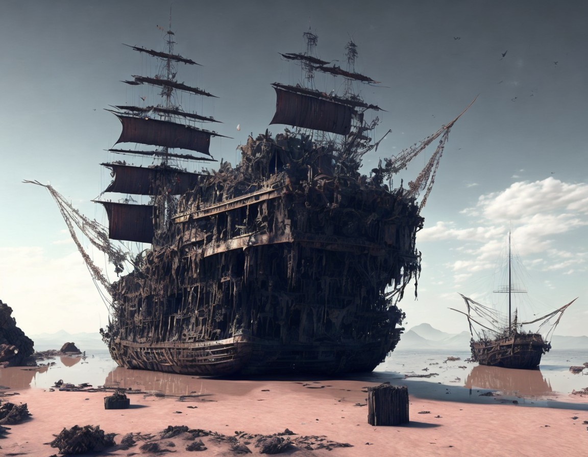 A large, majestic pirate ship with multiple sails rests on a sandy shore. Its weathered wooden structure contrasts with a clear sky, and a smaller ship is seen in the background.