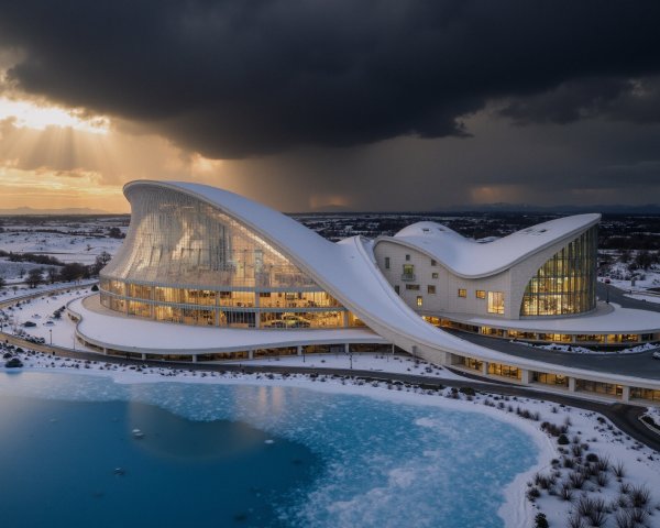 A striking modern building resembling a blooming flower, characterized by its fluid, white design. It reflects in a calm water feature, surrounded by greenery and cityscape under a dramatic sky.