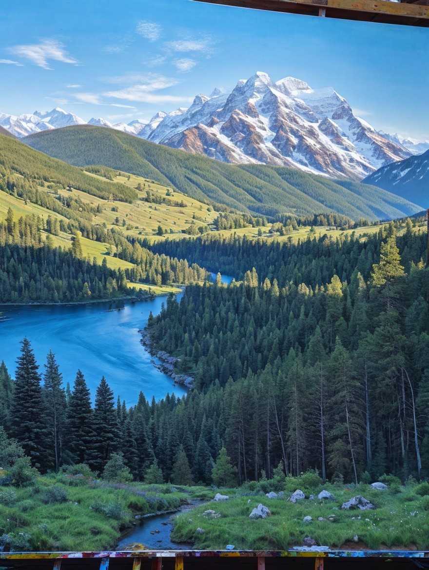 A serene landscape featuring majestic mountains with snow-capped peaks, lush green valleys, and a tranquil river winding through dense forests, under a bright blue sky.