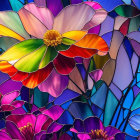 A vibrant arrangement of flowers in bright oranges, yellows, and pinks, set against a deep blue stained-glass background, showcasing intricate details and a lively, artistic flair.