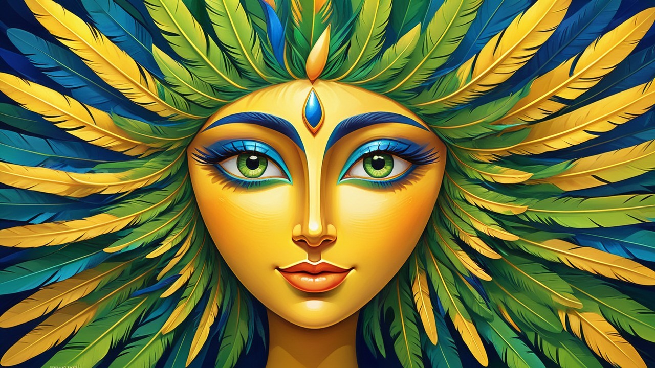 A vibrant, close-up depiction of a face adorned with intricate yellow and green mosaic patterns, featuring striking eyes and colorful feather-like elements, exuding an enchanting aura.