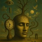 A surreal portrait of a young person with a serious expression, framed by a floating clock, clouds, and planets, including Saturn, set against a tranquil landscape of mountains and sea.