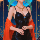 A woman in a shiny black bodysuit stands confidently, draped in an orange shawl. The background features celestial elements, including a large blue moon, enhancing the striking visual contrast.