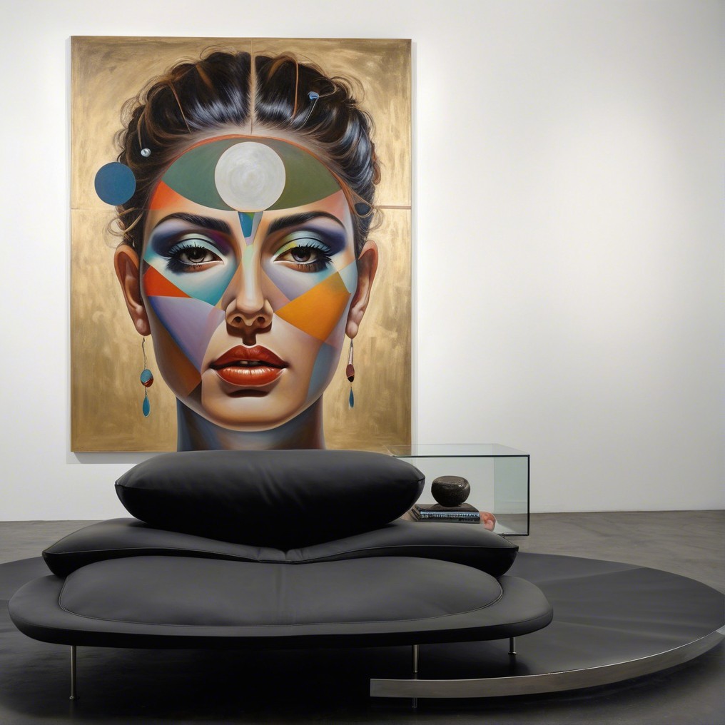 The artwork features a striking portrait of a woman with geometric patterns and vivid colors on her face. A clock is integrated into her forehead, symbolizing time and perception.