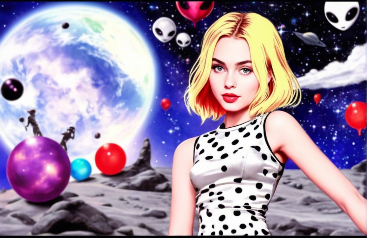 Stylish Woman in Polka Dot Dress in Cosmic Scene