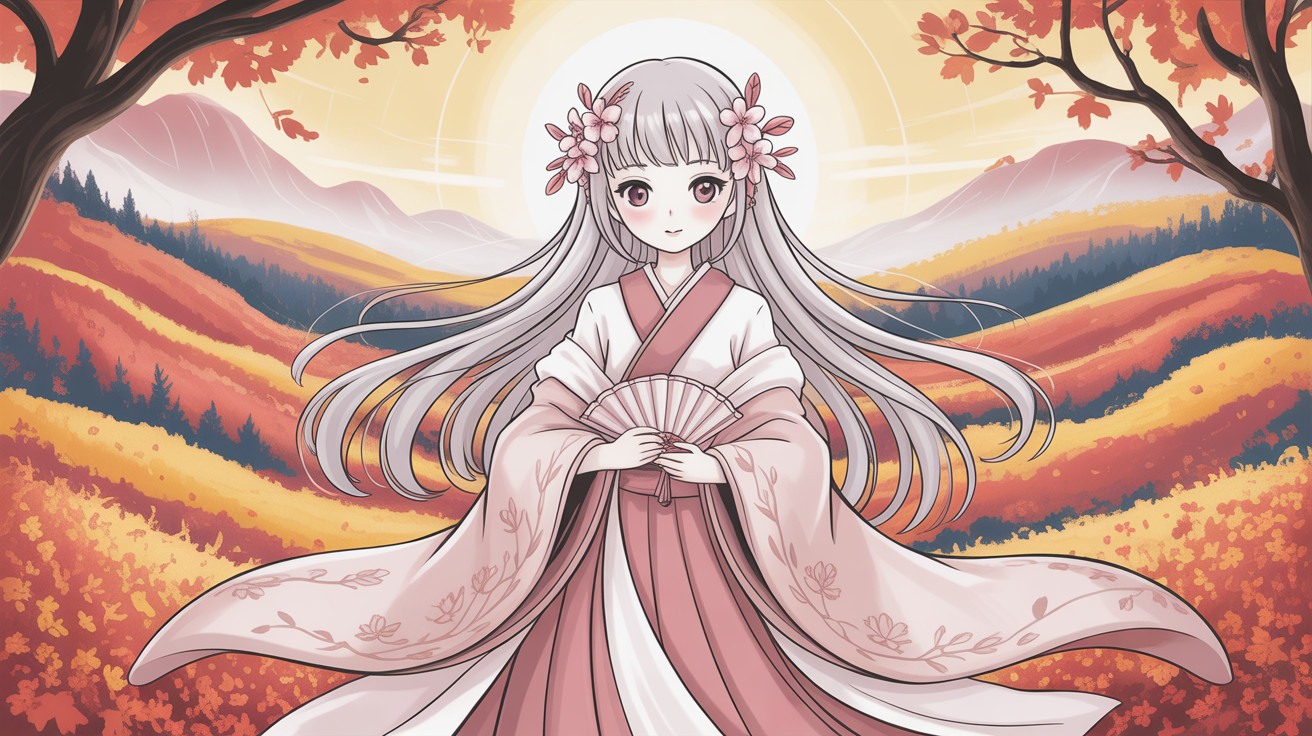 A charming anime goddess graces a serene taiga landscape, surrounded by towering conifers and soft, glistening snow. Her enchanting presence radiates warmth in the tranquil, wintry setting.