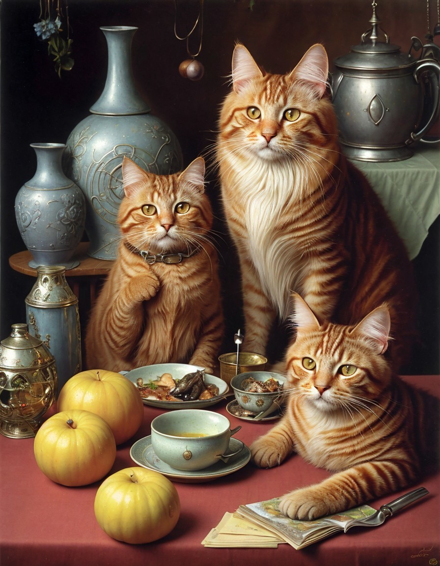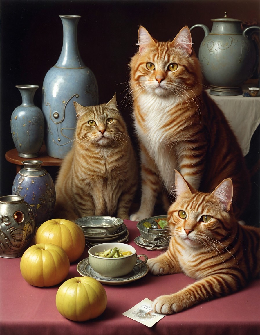 + Prompt:old very straggly fat ginger cat sat at the table as with a human pose with still life objects on table. The table has a tablecloth draped over it, close up eye level view Artwork By Leonora Carrington & Naoto Hattori & Nicoletta Ceccoli & Bosch & Jean-Baptiste Monge, Brian Froud, H. R. Giger, Zentangle Bosch, trending on Artstation, high definition, crisp quality, polished, add 7 clear wine glasses in the foreground, oil on canvas, ultra detailed, volumetric lighting, crisp detail,