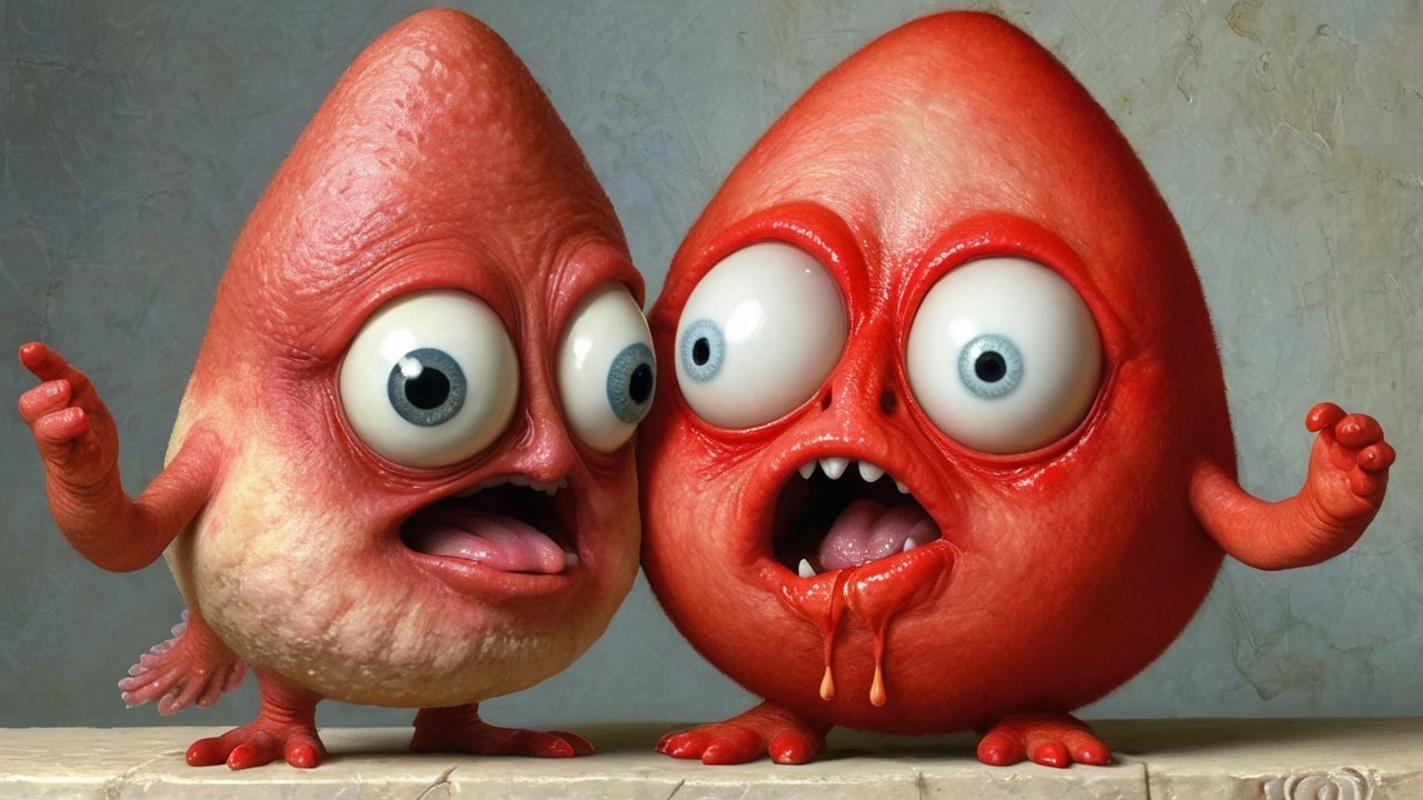 Prompt: Unpredictability defies oppressively frightening logic of life {Grumpy-Faced anti messiah Trypanohyncha Ocellus : by Soheyl Bastami, Seurat, Redon, Turner}_{comically grotesquely whimsical Hellish_Maggot_Vintage_Echoing_Visuals with one big red/milky googly eye up there and titanium chattering xenomorph teeth down there, It's playing Zebra_Cat's_225_Pug's game heart, (( giraffe antenna )) Panic! Elements of photorealism in a truncated hyper-surreal scene. Blended art style in one by: Molzahn, Hockney, Caulfield, Craig-Martin, Voynich, Luigi Serafini, dystopian bio horror feeling}_{Inspired by The Andromeda Strain (1971) and Luigi Cozzi's movie Contamination (1980)}