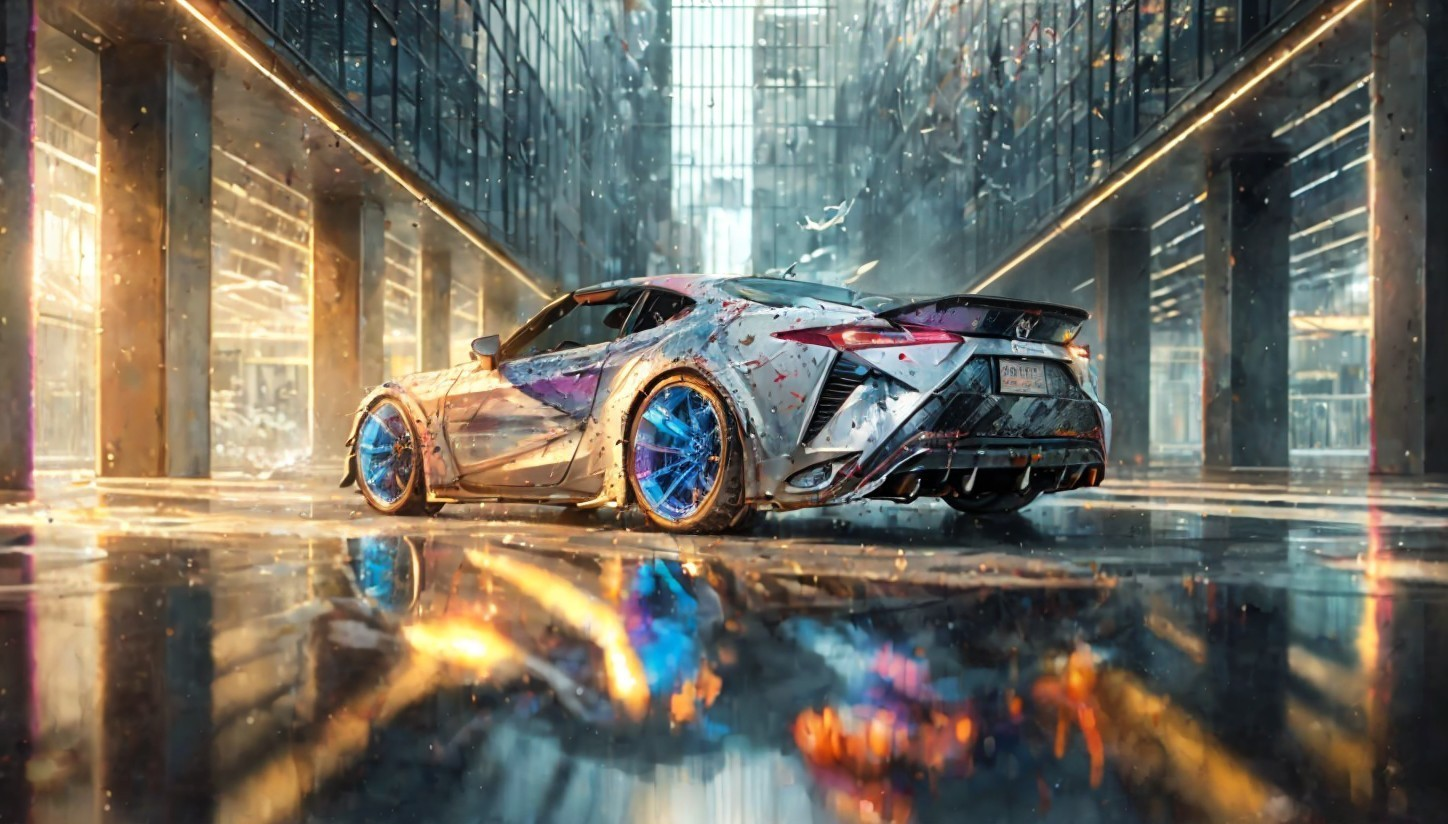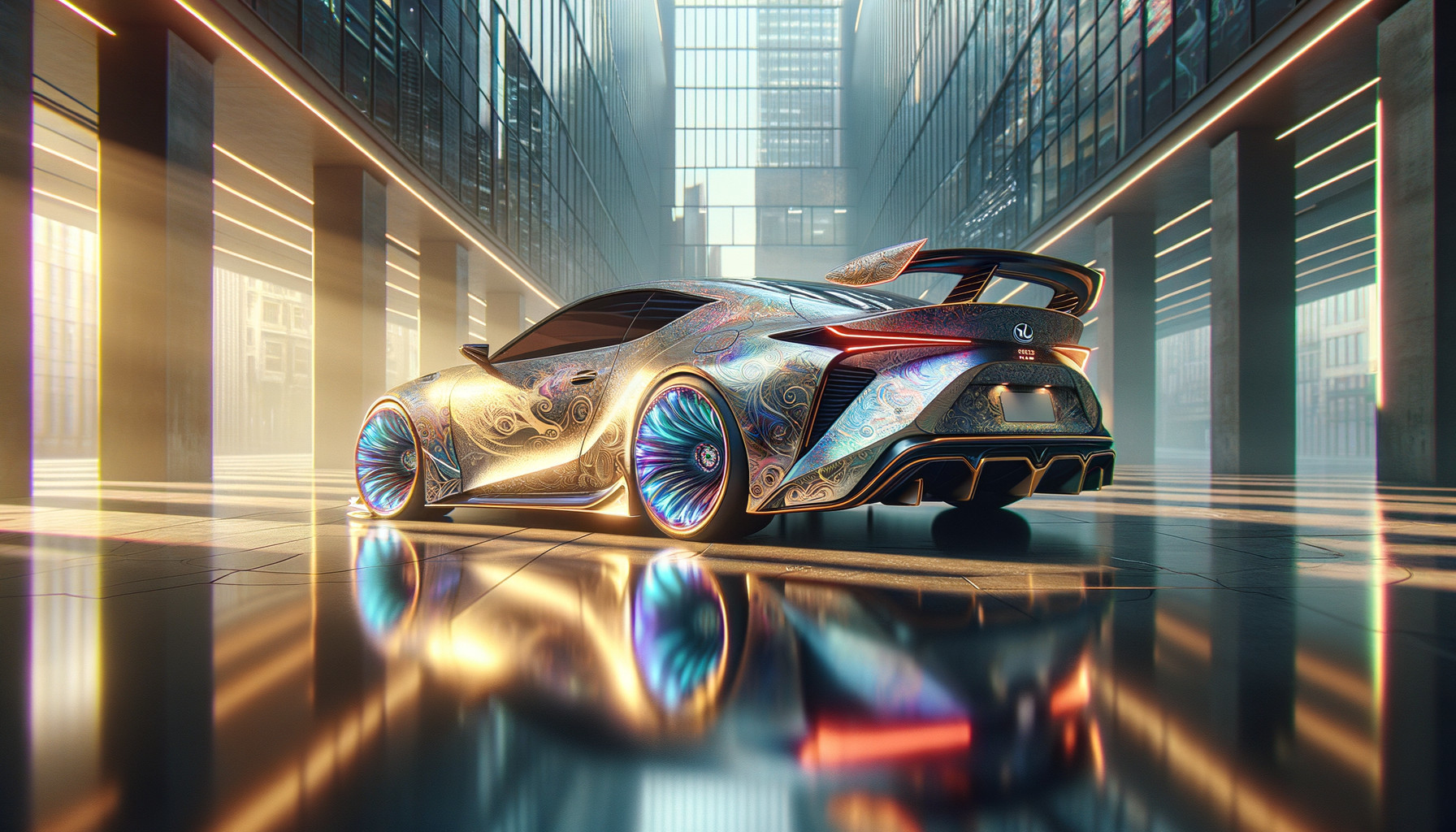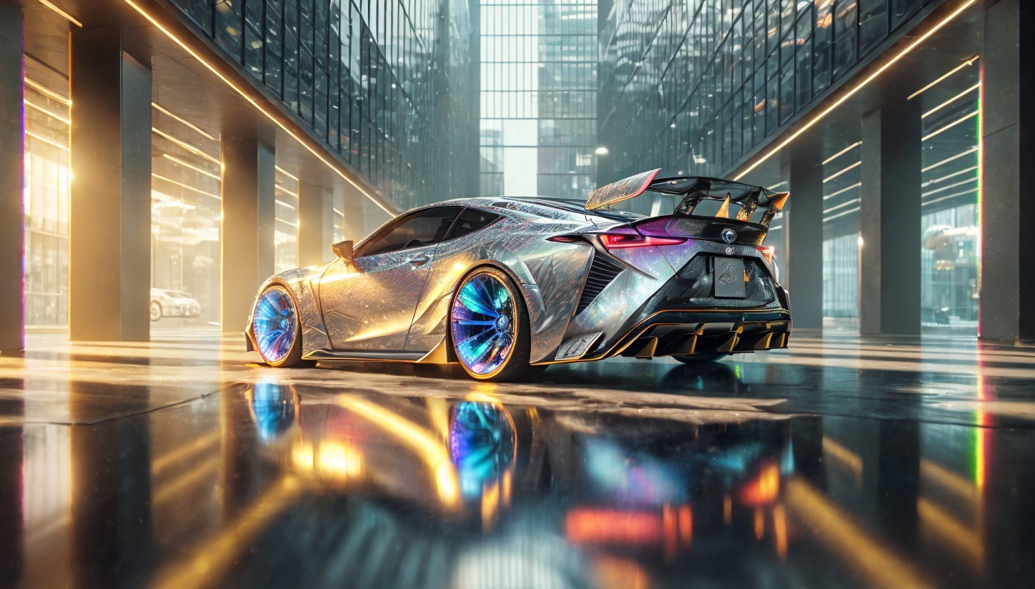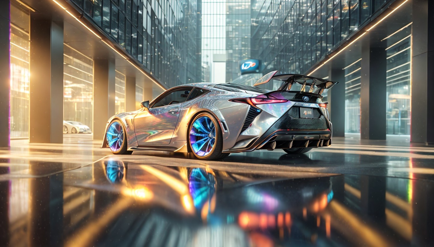 (Try from other user) - The image showcases a futuristic car with a vibrant, holographic finish. Set in a sleek urban environment, sunlight reflects off its glossy surface, enhancing its modern design.