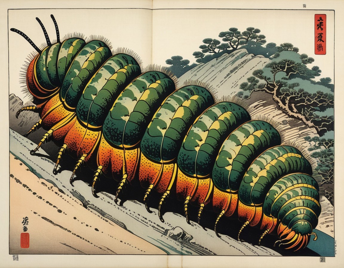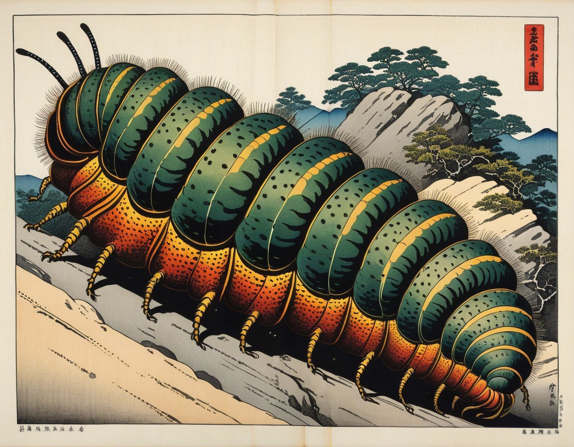 The image features a large, colorful caterpillar with vibrant patterns and textures, set against a backdrop of serene mountains and trees, reflecting a blend of nature and artistic design.