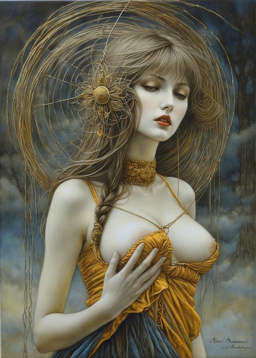 A serene woman with flowing hair stands against a moody sky, holding a delicate tool. She wears an ornate, golden gown, exuding an ethereal beauty, surrounded by intricate details.