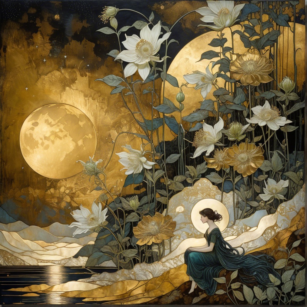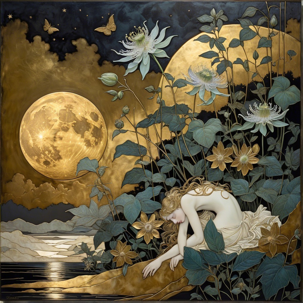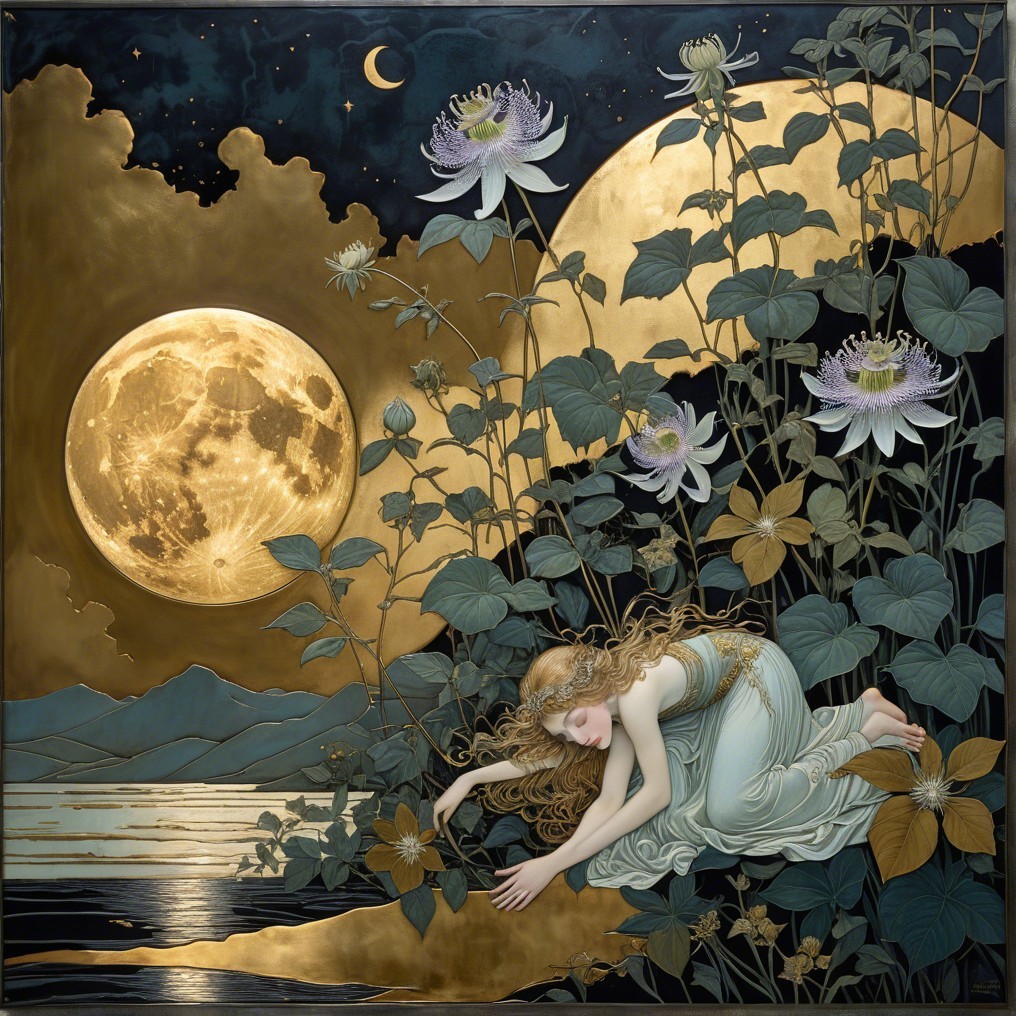 patina etched eau forte on metal, moonlit passionflower meadows, distant uplands town, (deeply etched) lines, intricately detailed crisp quality, gold leaf highlights, dark mood, style of Rebecca Guay, style of Mandy Jurgens, composition must originate from a human artist, silvered moonlit edged light and shade, stormy, (cinematic) in the style of Alexander Jansson. by Catrin Welz-Stein, Michael Parkes. By Rob Gonsalves, Markus Pierson
