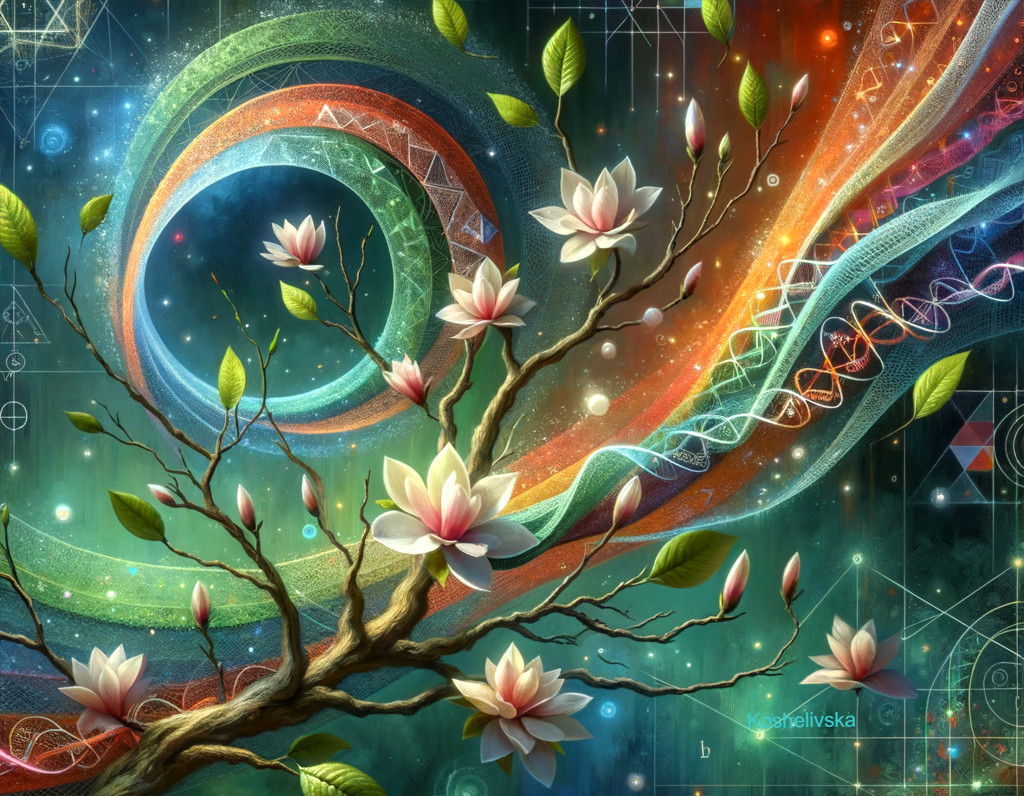 A vibrant artwork blending a blossoming tree with cosmic elements and DNA strands, symbolizing the intersection of nature and science.