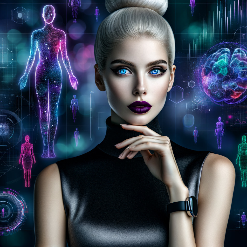 A futuristic woman with striking makeup and silver hair against a high-tech background with holographic displays and global data visualizations.