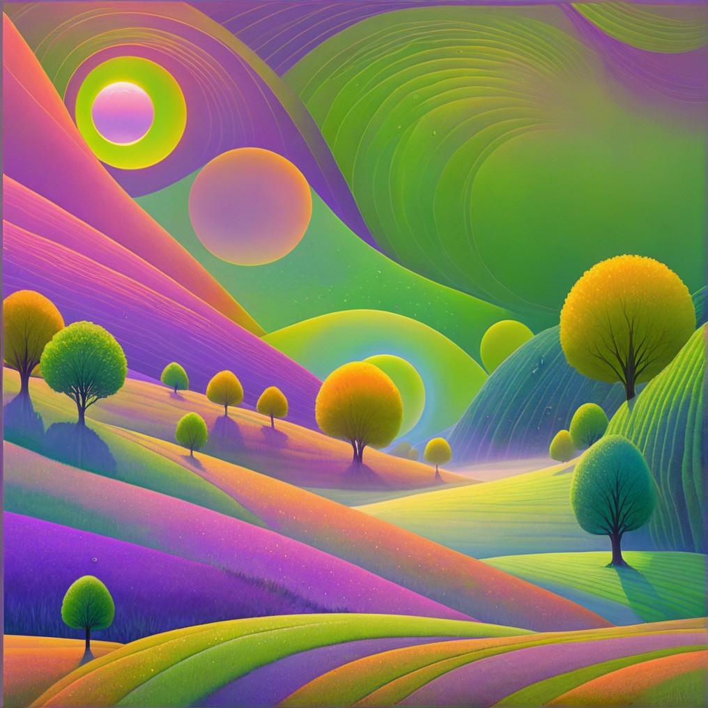 A vibrant landscape featuring rolling hills adorned with colorful trees, bathed in a surreal glow of purple, green, and yellow hues under a radiant sun, creating a dreamlike atmosphere.