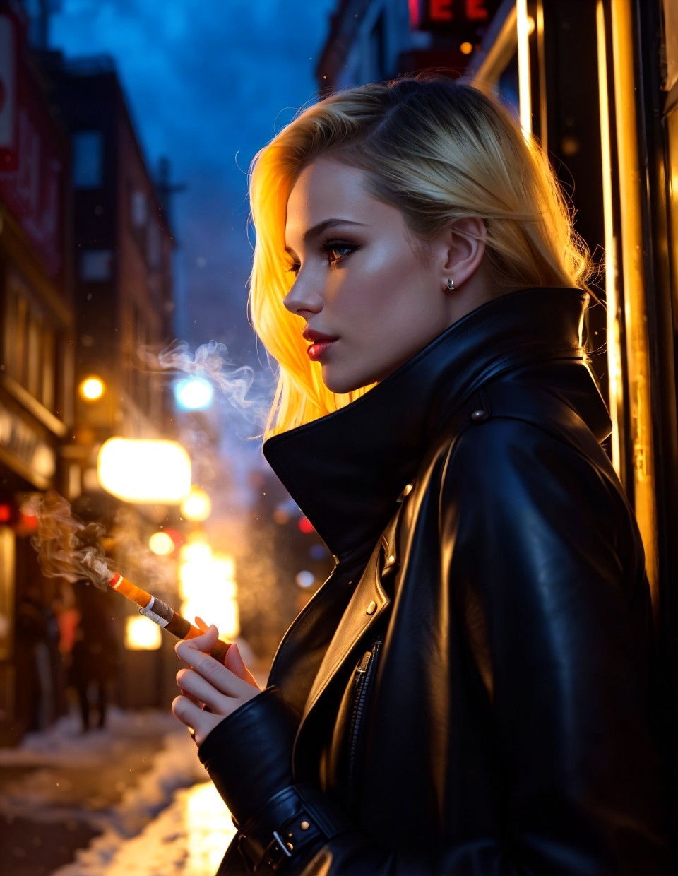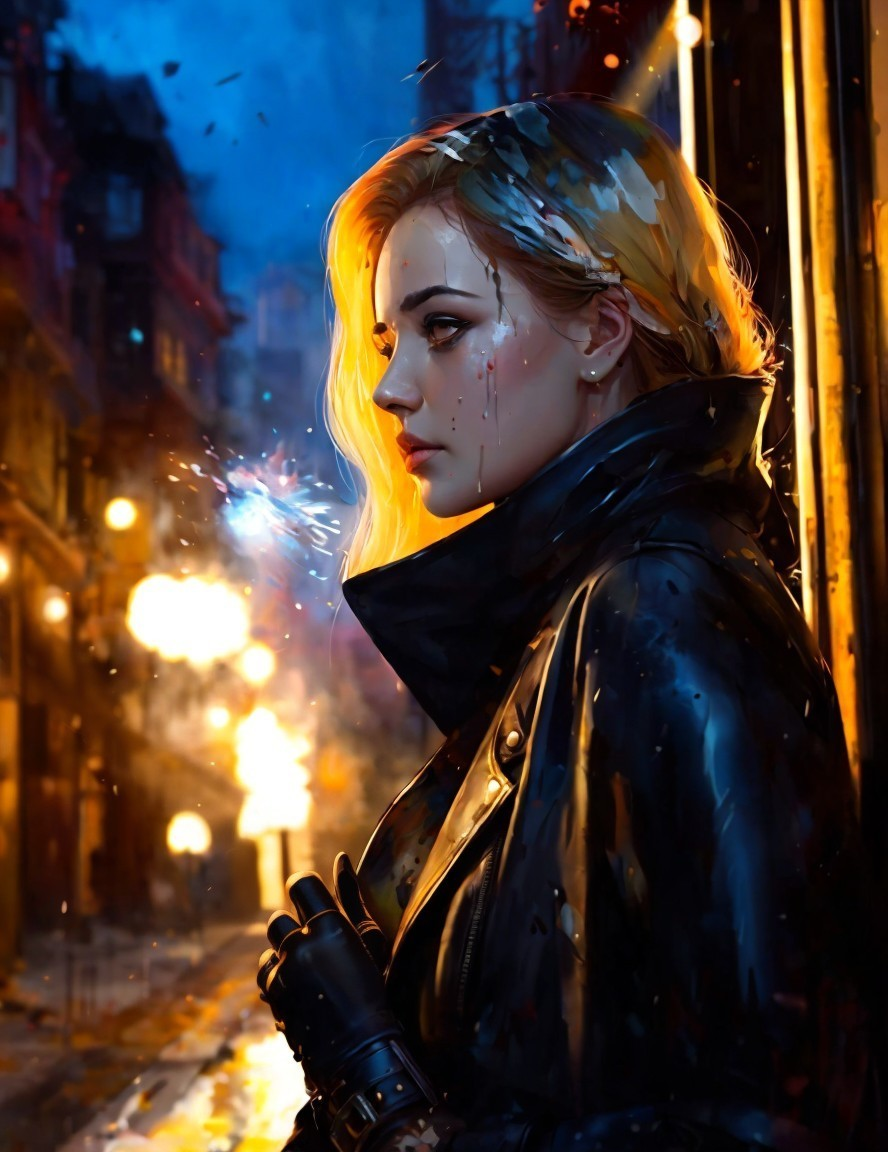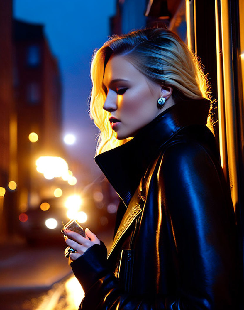In a moody, rain-soaked scene, a young woman with blonde hair stands in profile, wearing a stylish black leather jacket. Soft city lights glow in the background, creating a dramatic atmosphere.