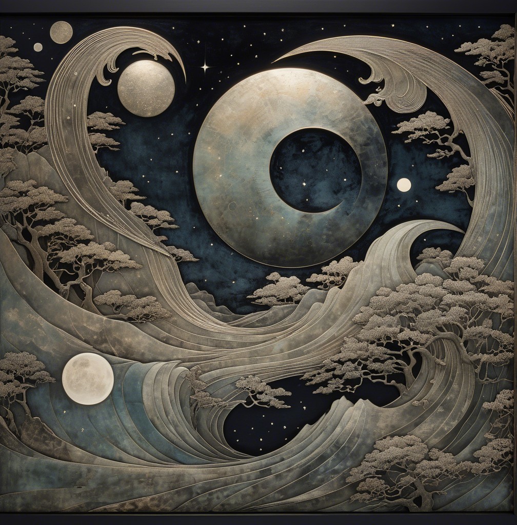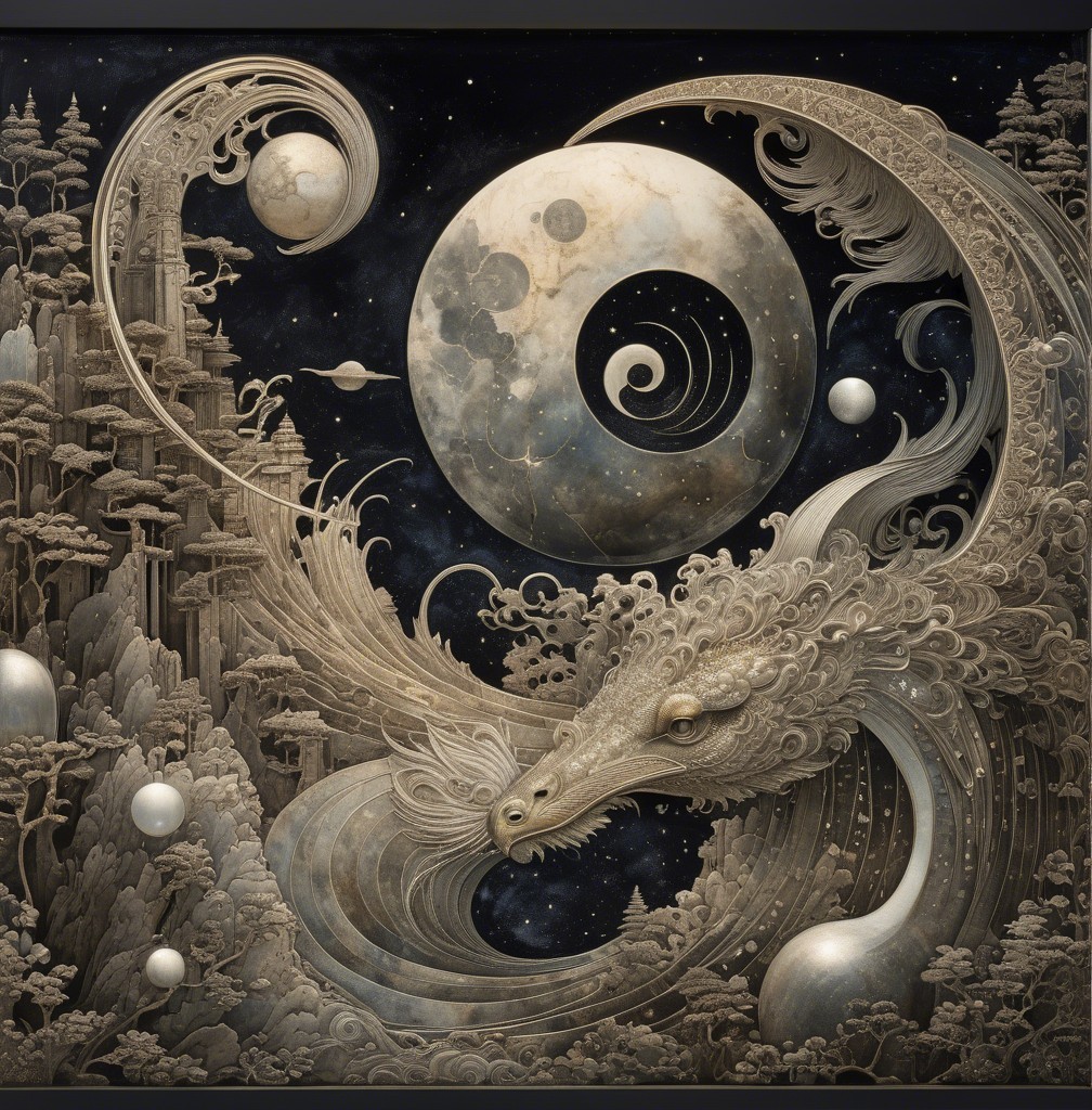 Surreal creature of night, of history and death and of light” in the style of Watanabe Shōtei, nostalgia, glory, Mercury Glass patina, light and gossamer haze, topographic lines, Art Brut, moody, somber, desaturated colors. In the style of John Rogers cox . This artwork amalgamates the artistic styles of Michael Parkes,