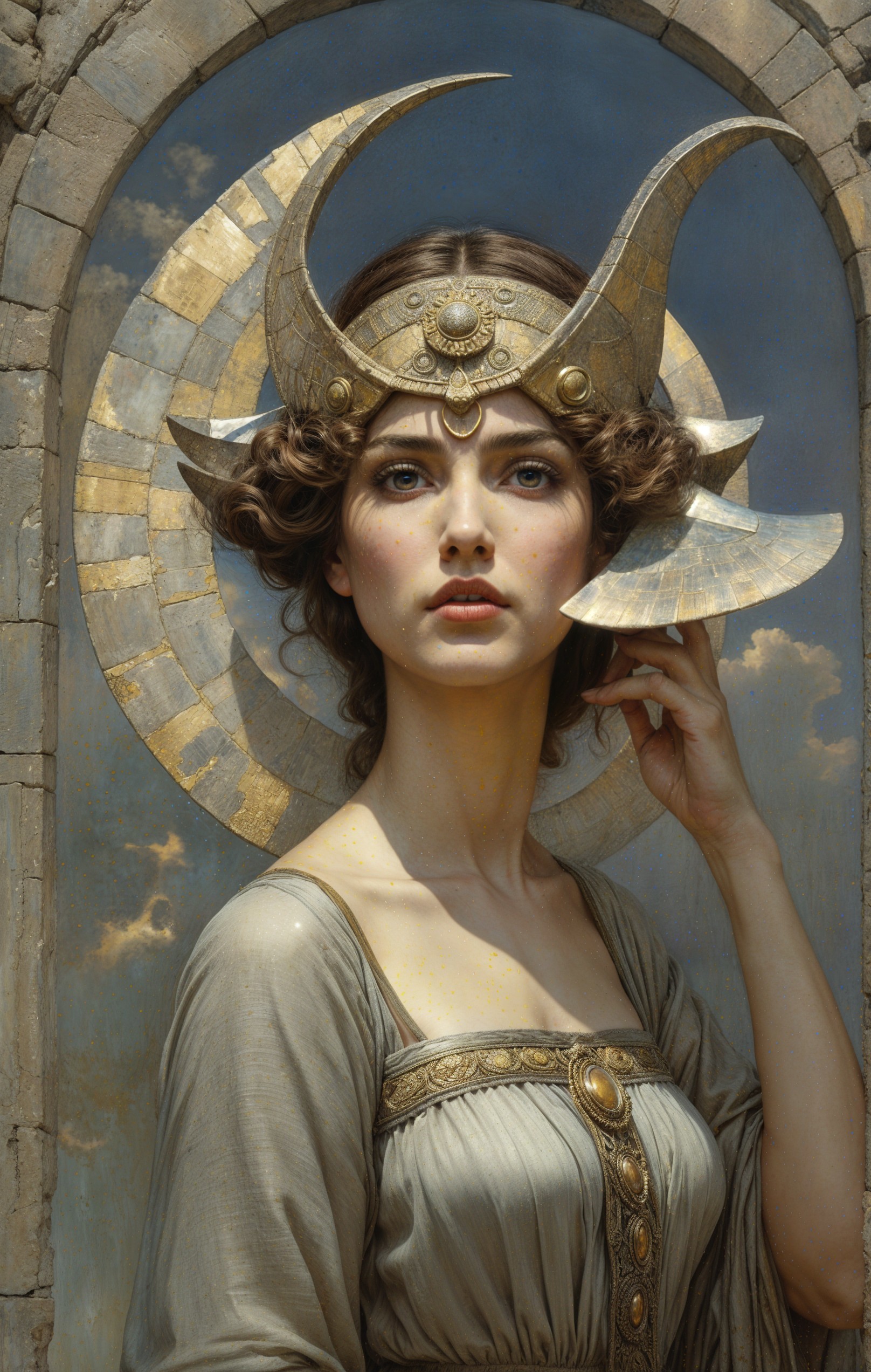 A poised woman in an elegant gown holds a golden helmet while gazing thoughtfully. Behind her, a large crescent moon and a dramatic sky frame an ancient stone archway, evoking a sense of mystique.