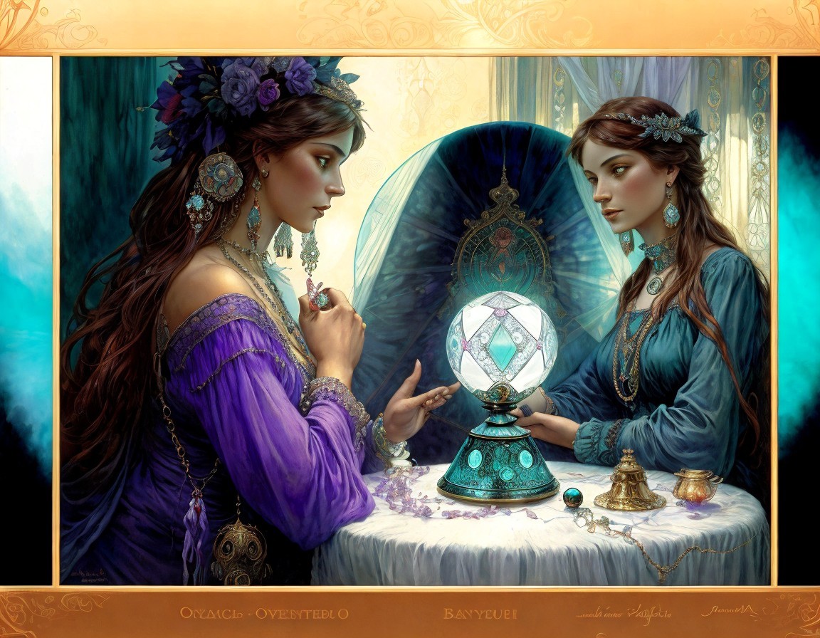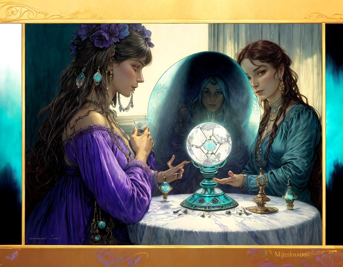 Digital artwork: Woman in purple dress gazes at crystal ball