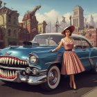 A vintage car with a fierce, toothy grill stands on a city street, as a stylish woman in a pink dress and hat poses beside it, blending retro charm with an edgy twist.