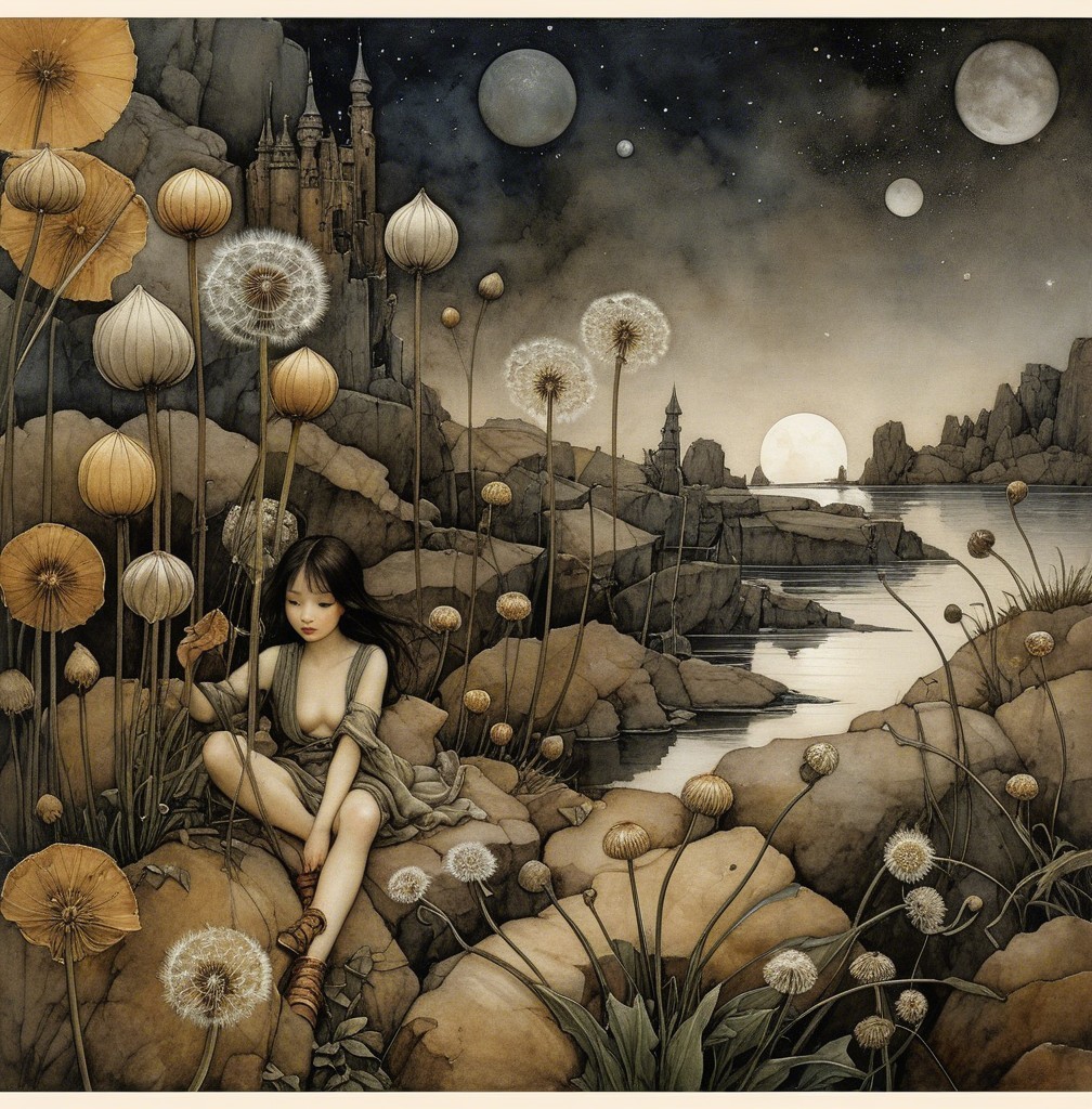 A delicate fairy with translucent wings sits among dandelions, bathed in soft moonlight. Her flowing gown and serene expression evoke a sense of magic and tranquility in a mystical garden.