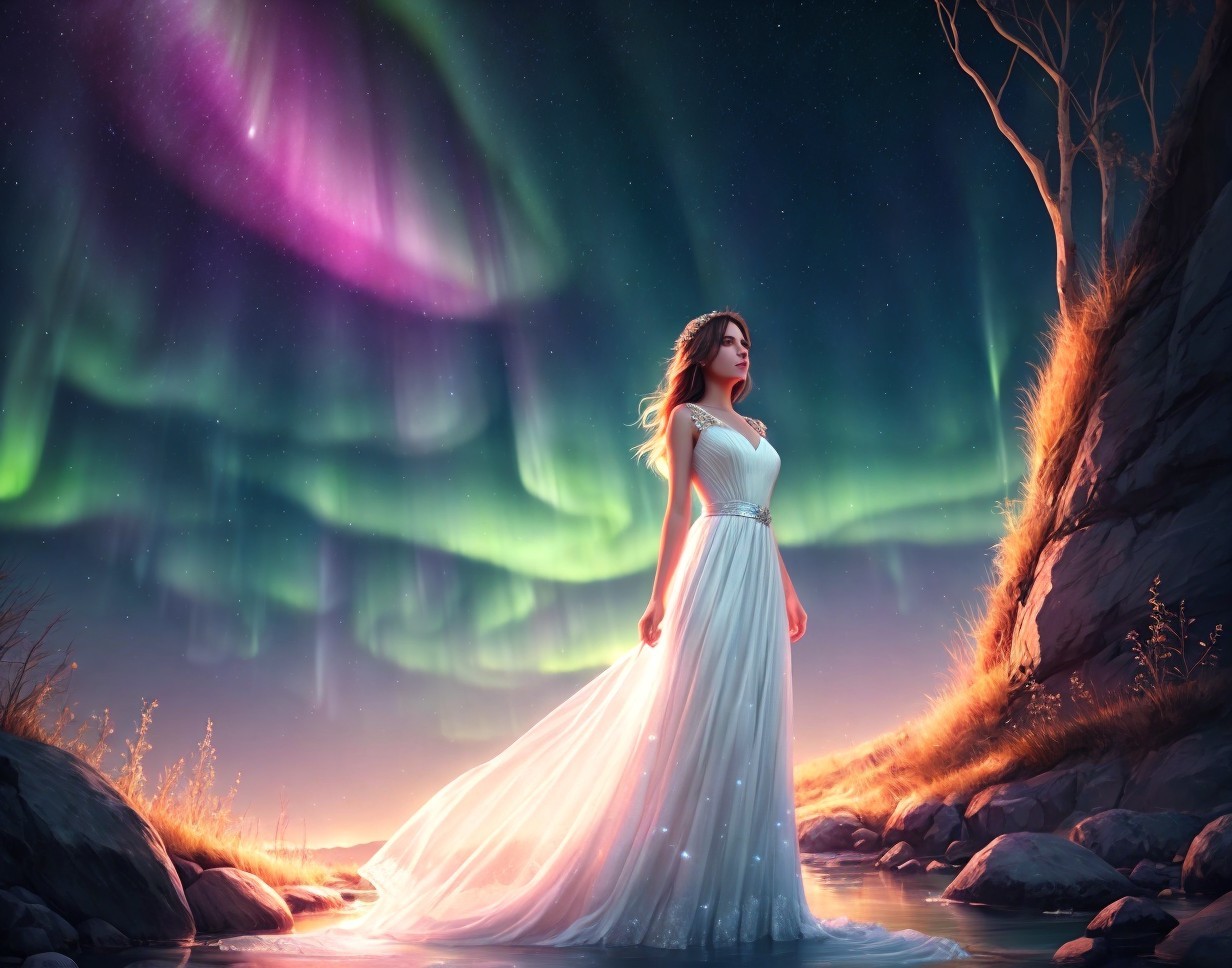 Woman in white dress by serene lake under aurora borealis in twilight landscape