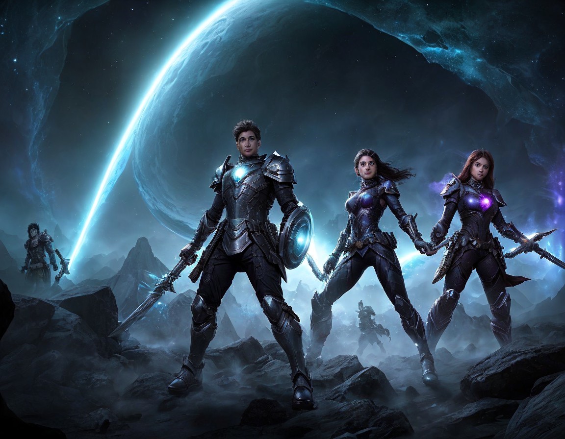 Gatekeepers from the Dungeon Dimension stride amid the gloamingstone canyon where the spirit of an entire world spins new realities amid the Cosmic Cascade.
