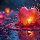 A whimsical red cottage with rounded architecture sits in a snowy forest, illuminated by warm lights. Nearby, a smaller structure and lanterns add to the enchanted atmosphere, reflecting in a pond.