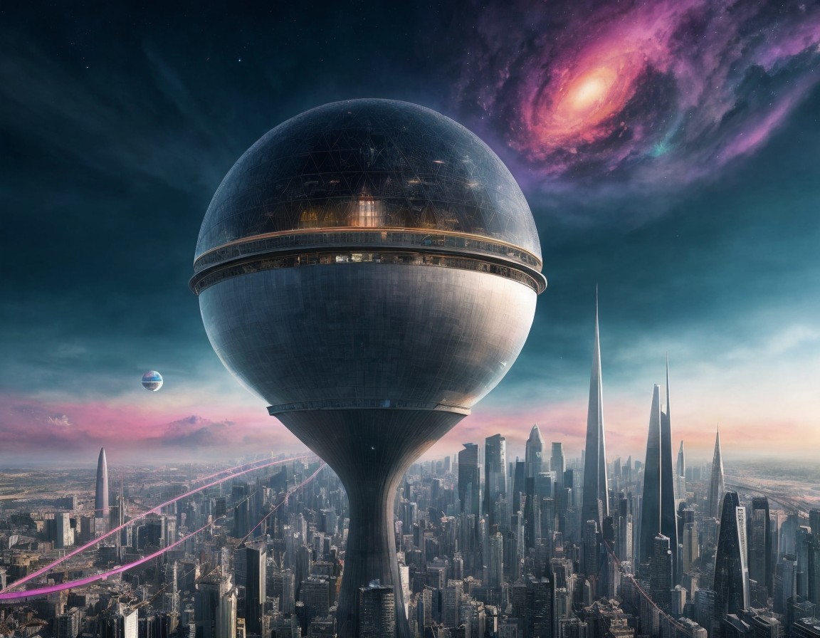 Modern city in space by Black hole, science fiction, domed buildings connected by bridges and tubes , metal monument. , bridges to the city, psychedelic cloud colors, stairs going from dome to dome, photorealistic textures, Mixed media By M.C.Escher, Beksinski and Bill Sienkiewicz. Colorful palette