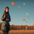 A young woman stands confidently in a vibrant, surreal landscape with bright stars and a moon above. Autumn colors fill the scene, featuring a quaint village and lush gardens in the background.