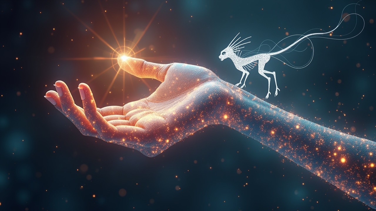 Prompt: "Compact Image Concept: Glowing Hand and Cerebral Alien Leap Surreal digital art. Hand reaching out, glowing fingertips touching/interacting (creating, healing, casting spell). Glow illuminates surroundings. Hand has sleek, dragon-like tail. "Alien leaping" emerges from "cerebral realm." Abstract concept, visually represented by AI. Form is dynamic, fluid. Conveys liberation and transformation.Compact Image Concept: Glowing Hand and Cerebral Alien Leap Surreal digital art. Hand reaching out, glowing fingertips touching/interacting (creating, healing, casting spell). Glow illuminates surroundings. Hand has sleek, dragon-like tail. "Alien leaping" emerges from "cerebral realm." Abstract concept, visually represented by AI. Form is dynamic, fluid. Conveys liberation and transformation."