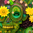 The image features a vibrant, intricately designed skull surrounded by colorful flowers. The patterns are bold and swirling, creating a striking contrast between the skull and the floral elements.