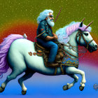 A whimsical scene featuring a bearded man in glasses riding a colorful unicorn, adorned with a saddle and decorated with intricate patterns, against a vibrant, starry background.
