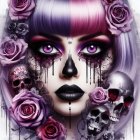 A striking portrait of a woman with vibrant purple hair and intricate makeup. She features bold pink lips, dramatic eye makeup, and is adorned with pink roses and glossy accents.
