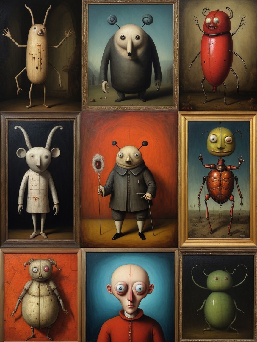 Brut Occult Toxic Positivity a thousand creepy Middle Ages Drolleries (((the bear chewed the guy))) Included Comical Yet Sinister as one Doll-beetle hybrids Abstract Surreal Schizophrenia by Anton Semenov & by Mark Rothko & by Harry Bliss & by Joan Miró