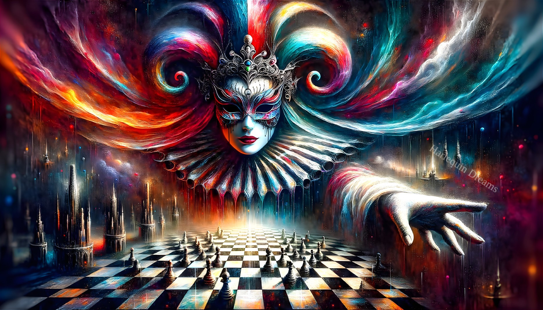 A vibrant, surreal painting of a masked figure extending a hand over a chessboard, with swirling cosmic colors and cityscape.