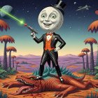 A whimsical scene features a cartoonish moon in a top hat wielding a laser gun, triumphantly standing on a vibrant red dinosaur in a colorful alien landscape with distant planets.