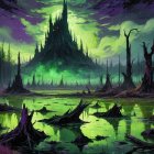 A dark, eerie landscape features a gothic castle atop a hill, surrounded by twisted trees and a murky swamp. Ominous purple clouds loom overhead, enhancing the haunting atmosphere.