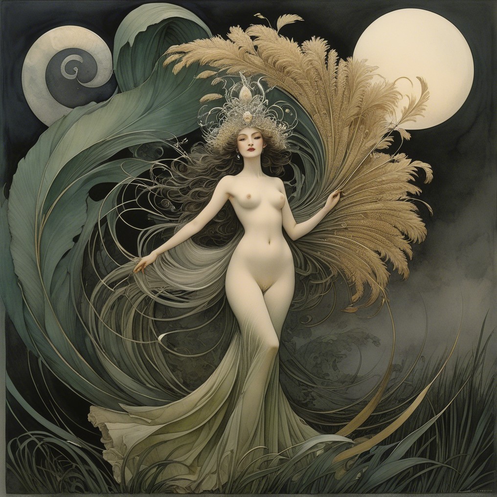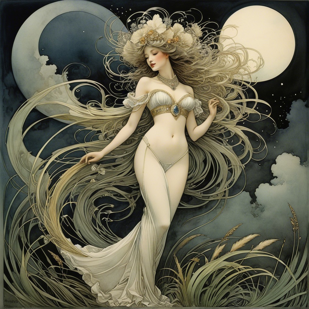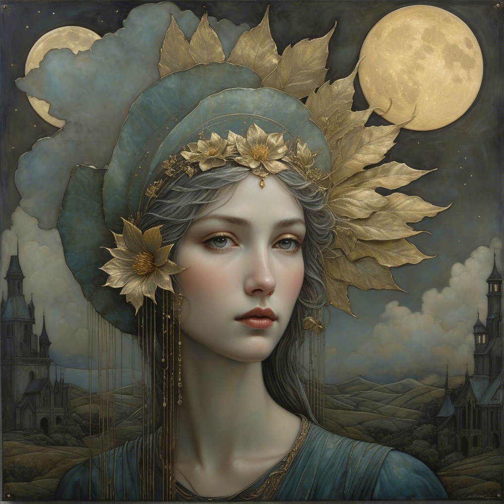 A graceful woman in a flowing white gown stands under a full moon, adorned with a large straw hat and floral accents. Long hair and delicate fabrics create a dreamy, ethereal atmosphere.