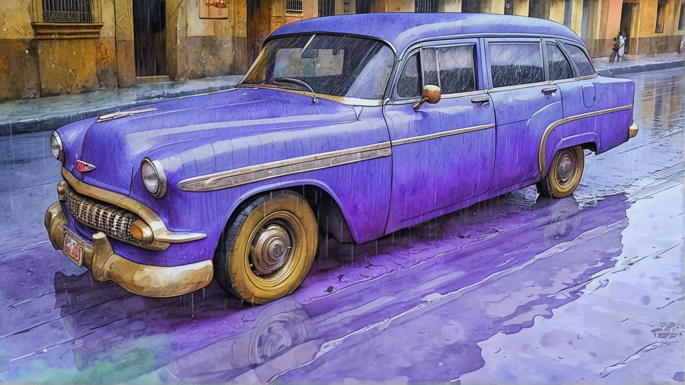 A vintage purple car sits on a rainy street, reflecting puddles. A young person gazes thoughtfully from the driver's seat, surrounded by a nostalgic cityscape of vibrant buildings.