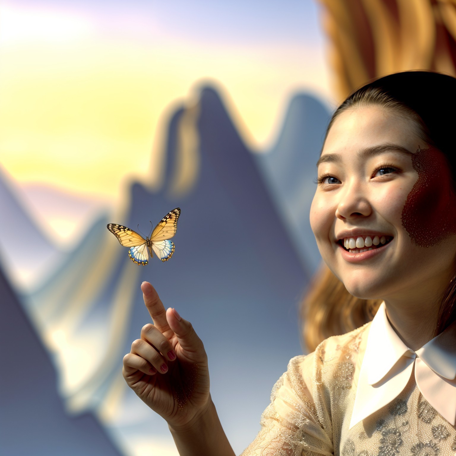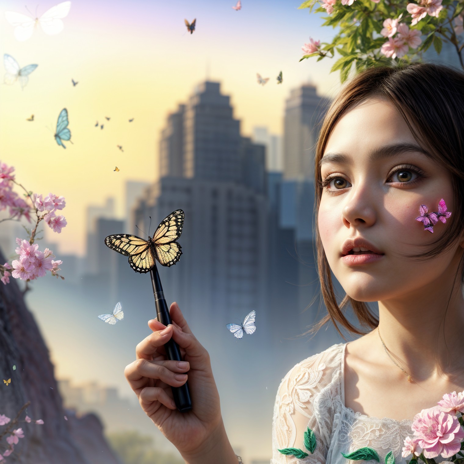 A young girl gazes serenely, surrounded by colorful flowers and fluttering butterflies. Soft sunlight filters through blooming trees, creating a magical, dreamy atmosphere.