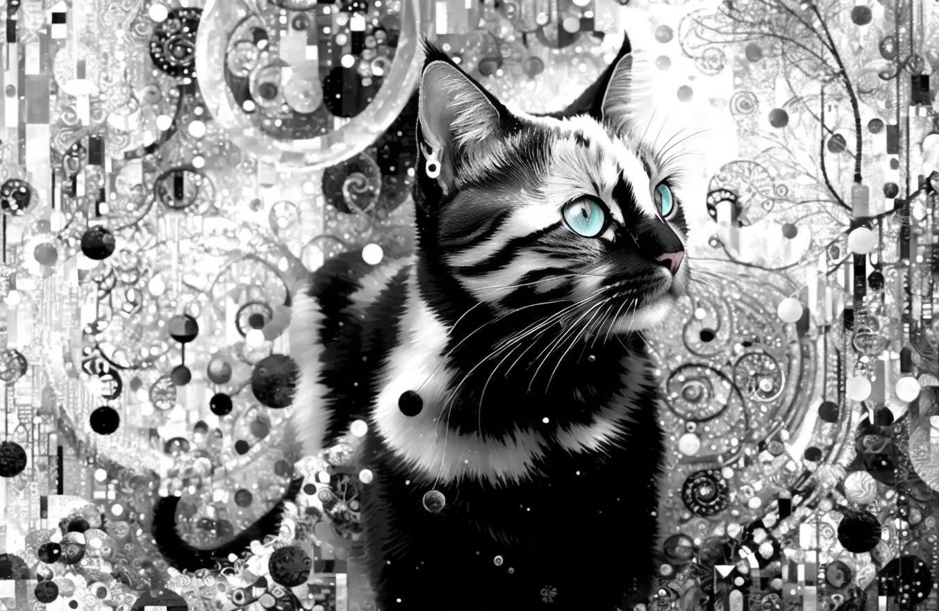 151515:[Goddess, Wet black and withe in dot art dreamy cat portrait with lot of Christmas decorative elements on white canvas illustration described in the perfect biomorph style of Vassily Kandinsky, Gustav Klimt and Jeremy Mann {HQ, 4K}]