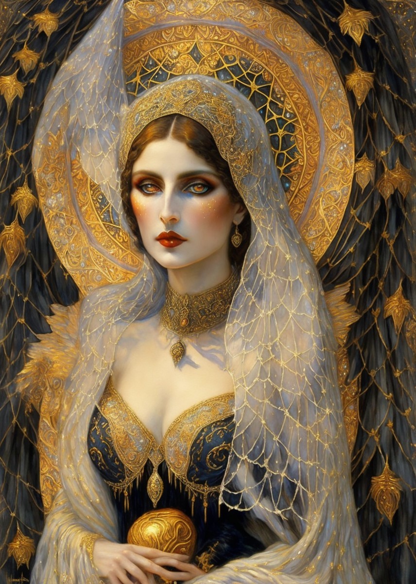 Prompt: “angel of night, of history and death and of light”. Dark gothic gypsy sorcerer bat woman of the night, spider web veil, in the style of Wolfe Von Lenkiewicz ,style klimt e Van Gogh