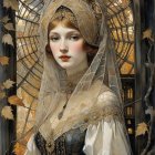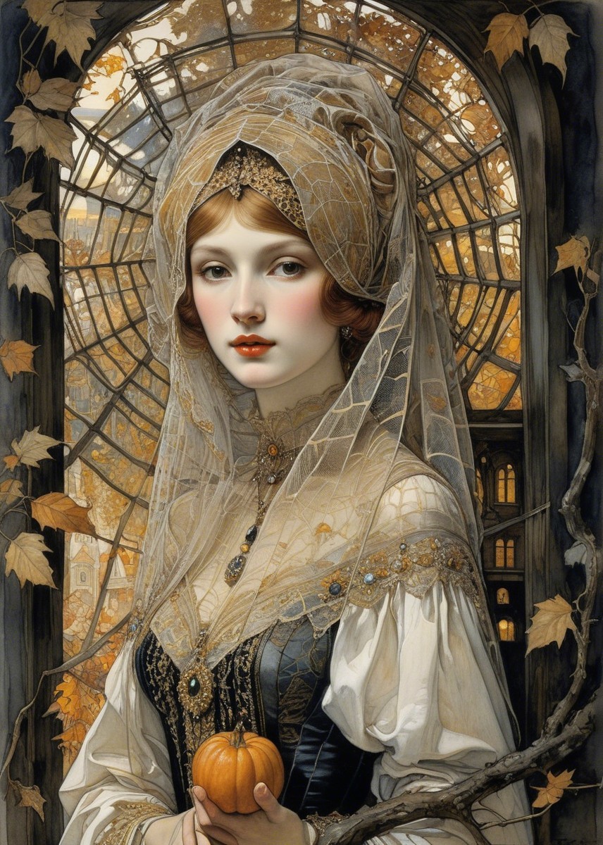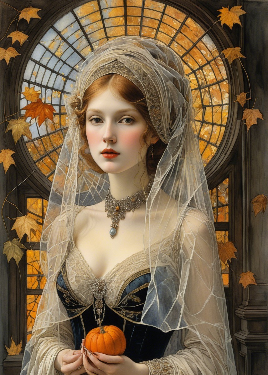 + Prompt:FIRST AUTUMN lights in the old interior, spider web veil, in the style of Wolfe Von Lenkiewicz ,style klimt e Van Gogh