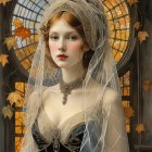 A mystical figure adorned in a dark gown, with a delicate veil and golden crown, holds a small pumpkin. The background features spider webs and autumn leaves, creating an enchanting Halloween atmosphere.