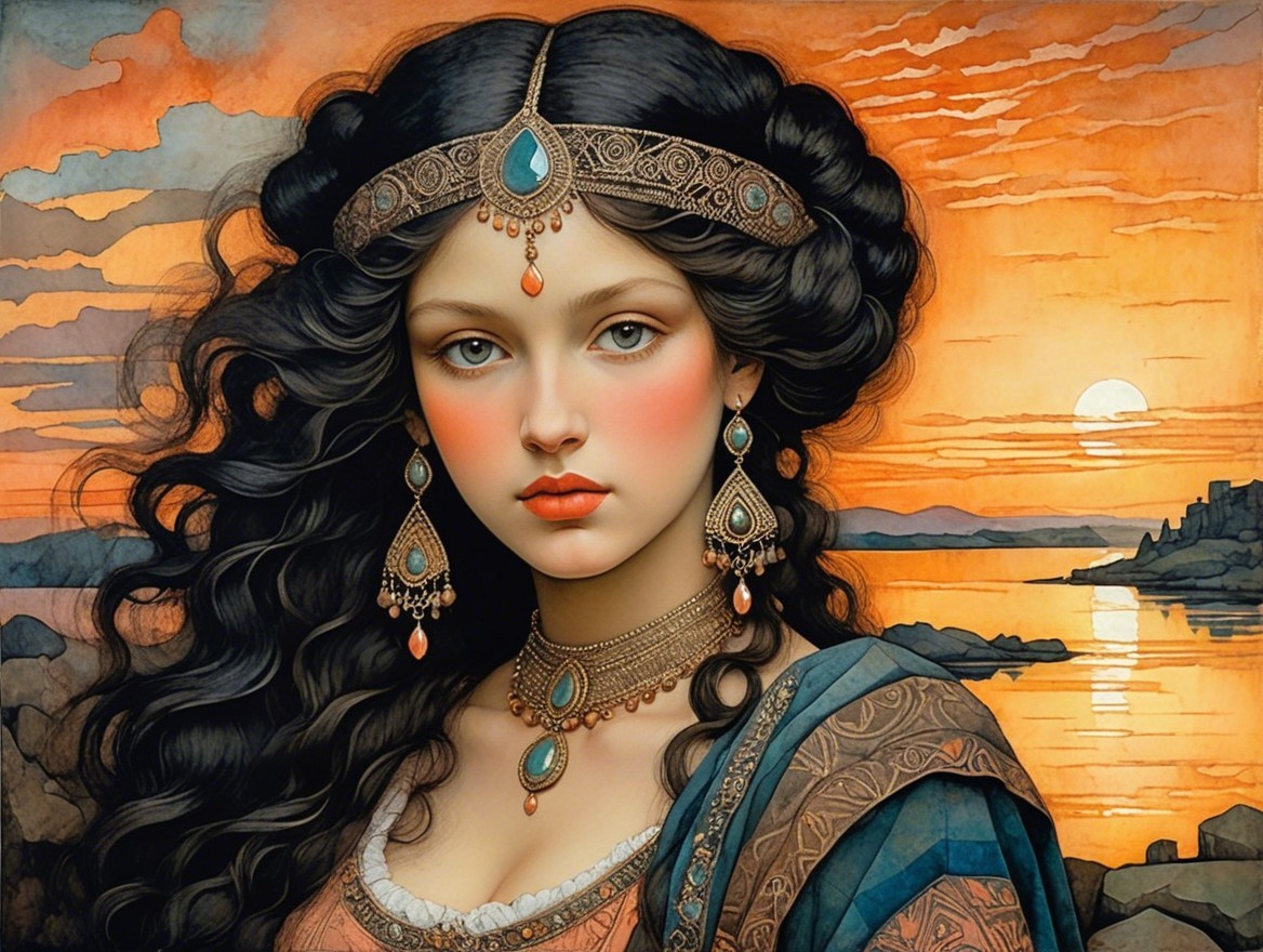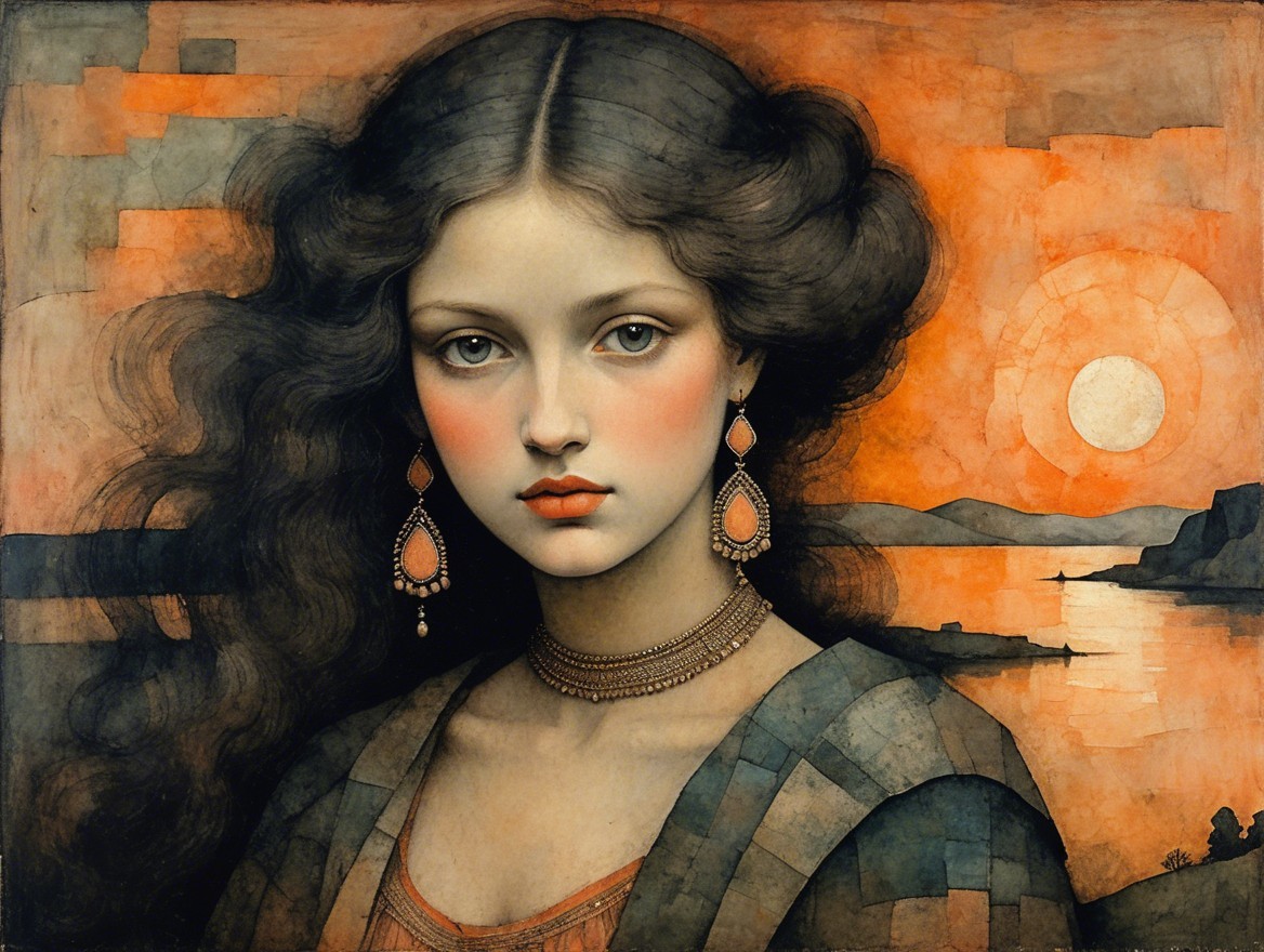 Prompt: Beautiful woman, portrait in peach and umber, patina of ancient stone with moss, art brut, moody, somber, desaturated colors, in the style of Paul Klee, Arthur Rackham